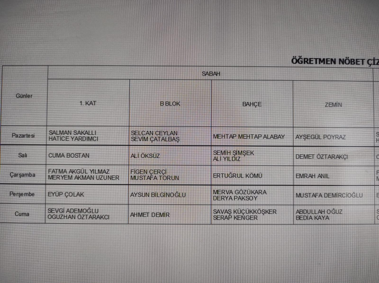Öğretmen Nöbet Çizelgesi
